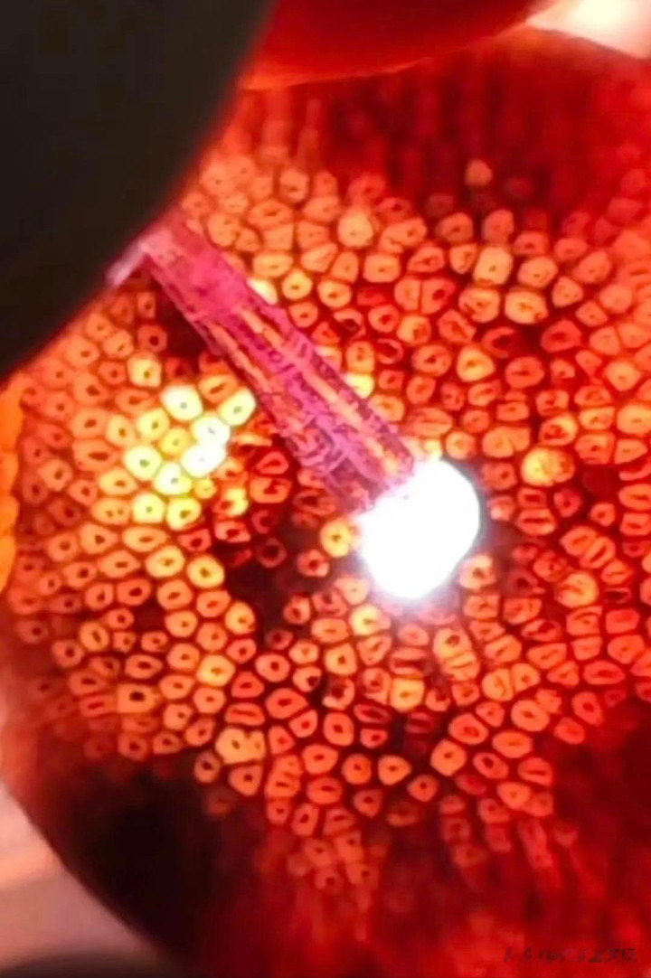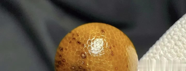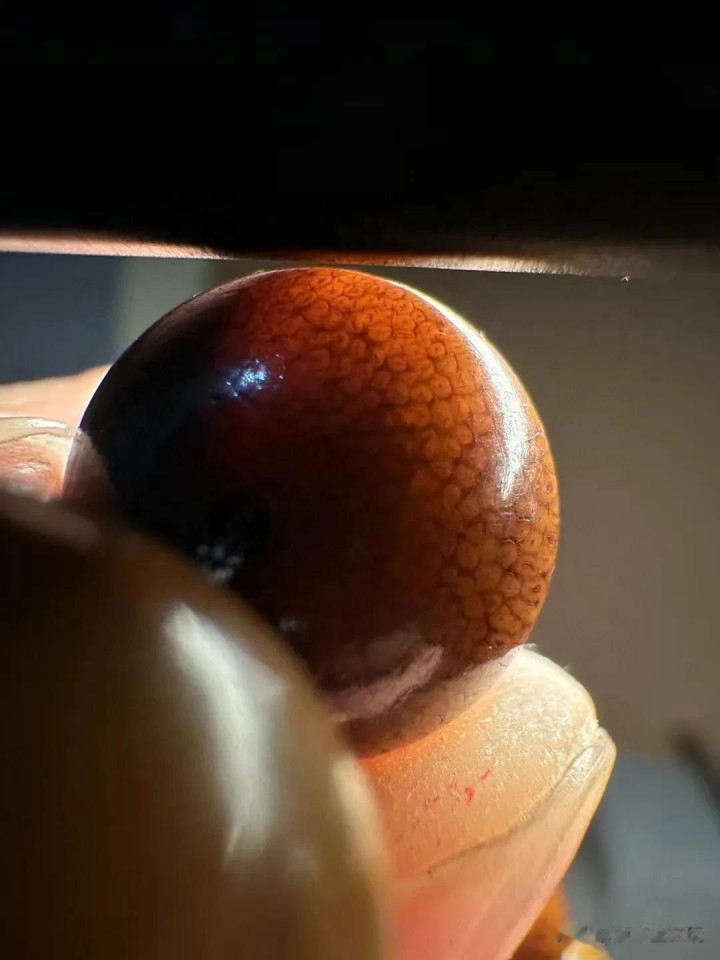 犀角手串要看真假,还得借用放大镜,有些品种纹理太细小了,肉眼很难区分。你可以看一下,通过放大镜咱们能看到一大堆小小的深色点,他们紧紧挨着聚集在一起,东南亚风格装饰品圈点之间几乎没有间隙,就像青蛙卵一样的一个个大小不一。这些小点就是鉴定师傅常说的鱼子纹理。一般在犀角的横切面能看到,珠子的话在孔道附近。