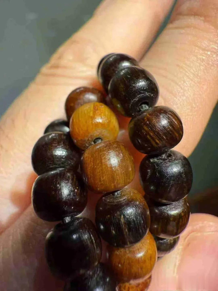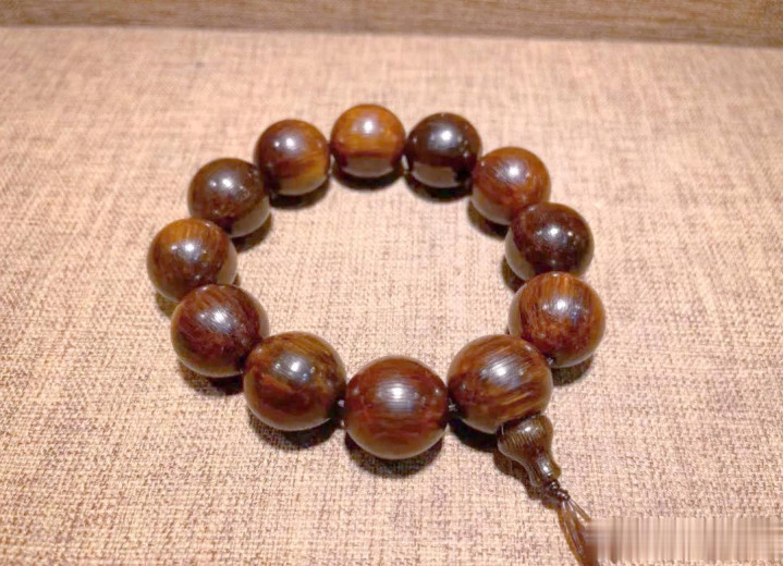 首先从品相上来看一条正宗的老犀角手串颜色可能看起来不太新了。要知道犀角是有机物,会慢慢会氧化变色。从古至今,犀有十来种,犀角的颜色也是很多样。这些新有的是偏蜜糖色,有些嫩黄,有的是花色(黑中带黄白)等等,随着几十年的氧化把玩,这些颜色会变成深沉的栗子色,深棕色,有的还可能是暗红褐色。整体的色泽更加内敛温润。像熬久了的蜂蜜糖浆。