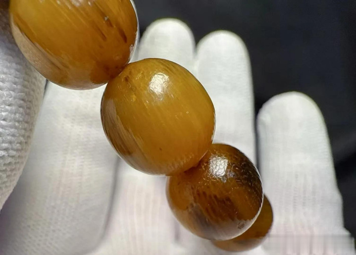 而在手串珠子的纵切面上,咱们能看到一些竹丝纹理。这些细细的,像头发丝一样的深色线条非常顺直,不交叉,都是平行到底。有点像劈开的竹丝或者木桩。而且需要注意的是这些纹理不是浮在角表面或者凹进去,触感上是平整的,有些树脂仿造会有沟壑感,其实是不对的。