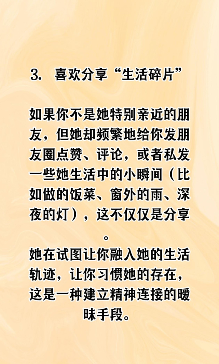 她可能是想多聊工作,也可能单纯喜欢你聊的话题。有人会突然分享生活日常,比如孩子照片或者健身打卡,但突然又不再提家里情况。这种若即若离的态度最容易让人搞不清方向。