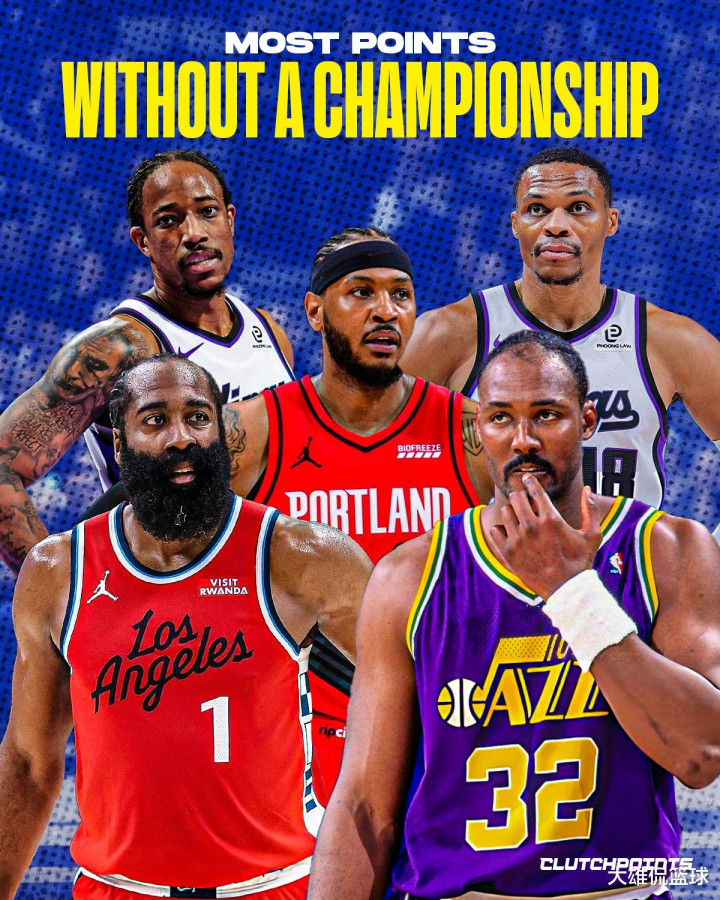 因为NBA历史上还有很多伟大的得分手,他们虽说没有拿到过总冠军,可是论得分能力,有些球星,不亚于这些拥有总冠军的球员。为此,美媒晒出了NBA历史上没有总冠军的球员中,职业生涯得分最多的9人,其中威少、詹姆斯哈登和德罗赞三名现役球星都在这份名单中。