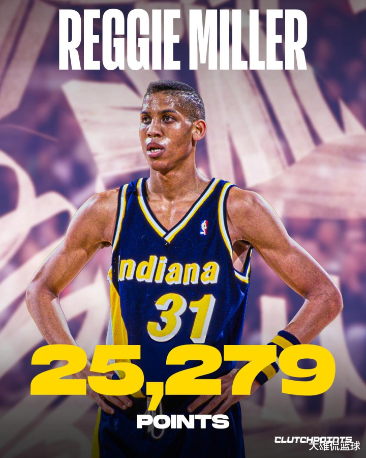 职业生涯一共拿到了25279分,却没有赢得过总冠军。雷吉米勒职业生涯都是在步行者度过的,巅峰末期进入总决赛,可惜遇到了如日中天的湖人。